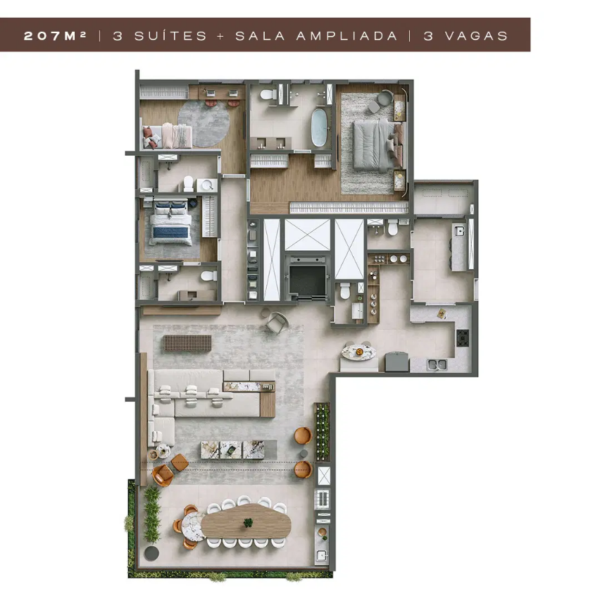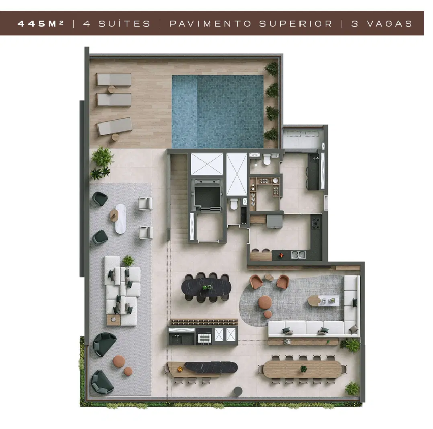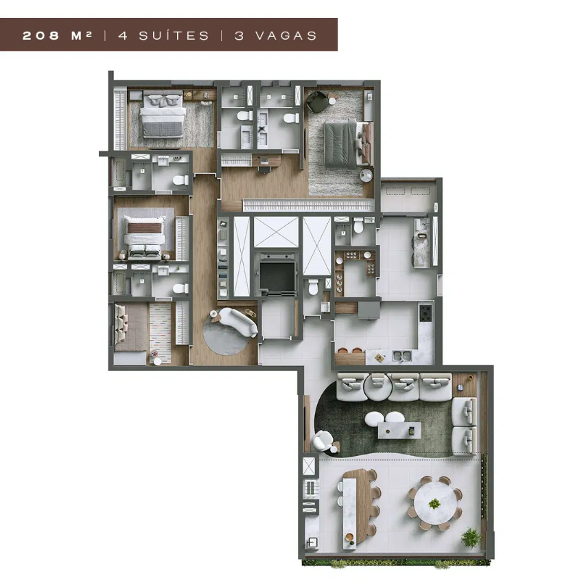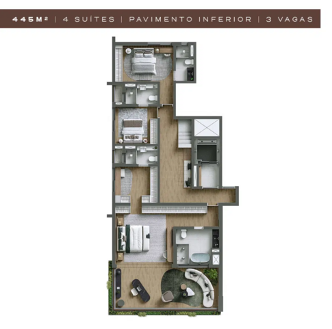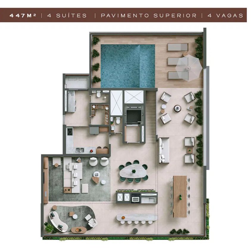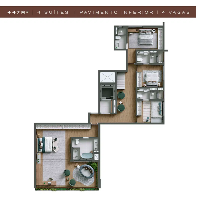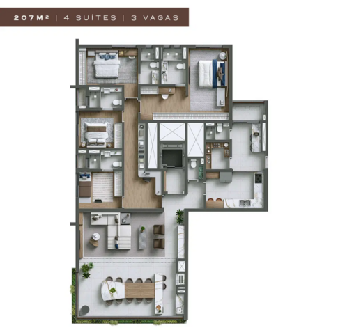 Com apenas 38 unidades em uma torre única, o empreendimento oferece apartamentos de 207m² a 447m², todos com quatro suítes, vagas demarcadas, depósito privativo e pé-direito duplo nos terraços e áreas de estar, proporcionando amplitude, conforto e exclusividade em cada detalhe.